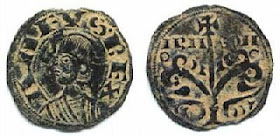 | Anverso y reverso de una moneda: "Dinero jaqués", acuñada por el rey Alfonso I el Batallador. Esta moneda se acuñó en Aragón hasta 1728. |